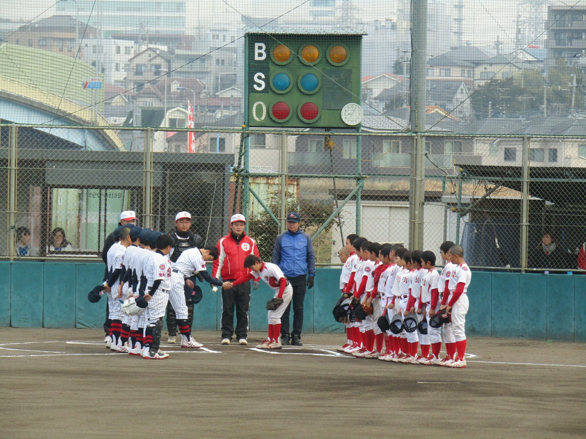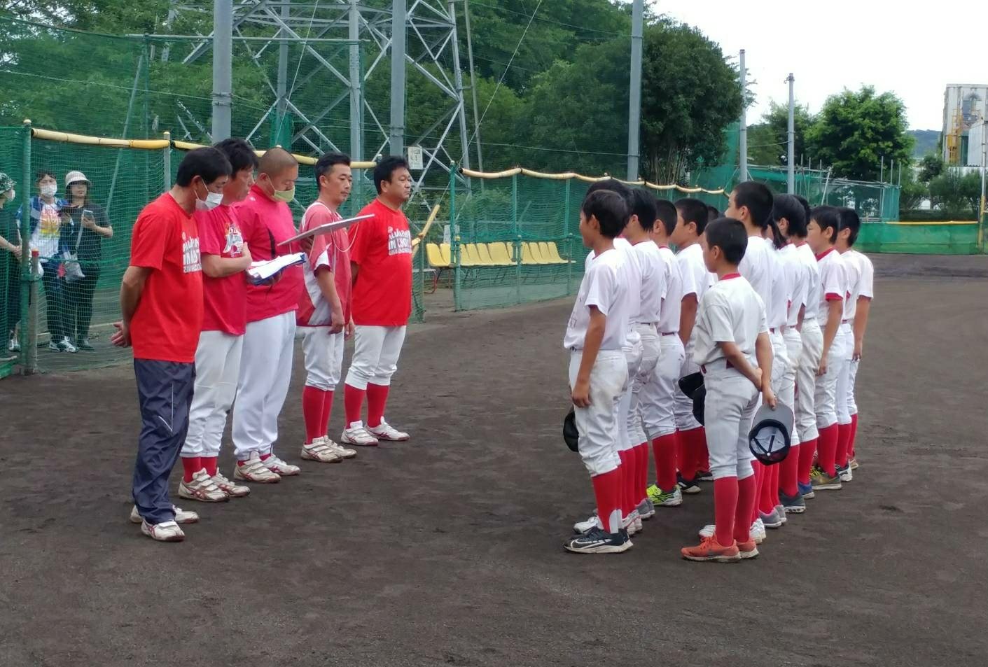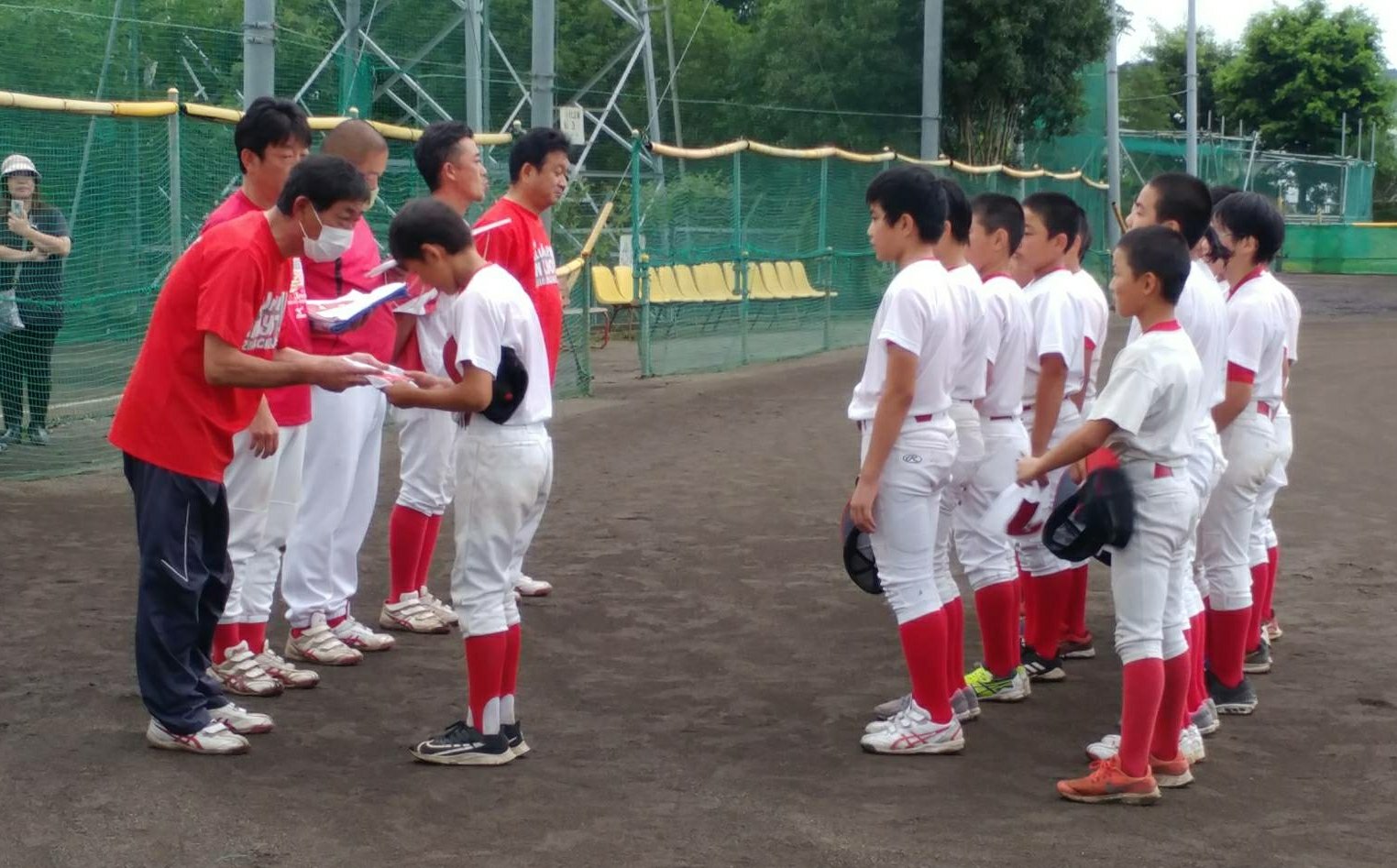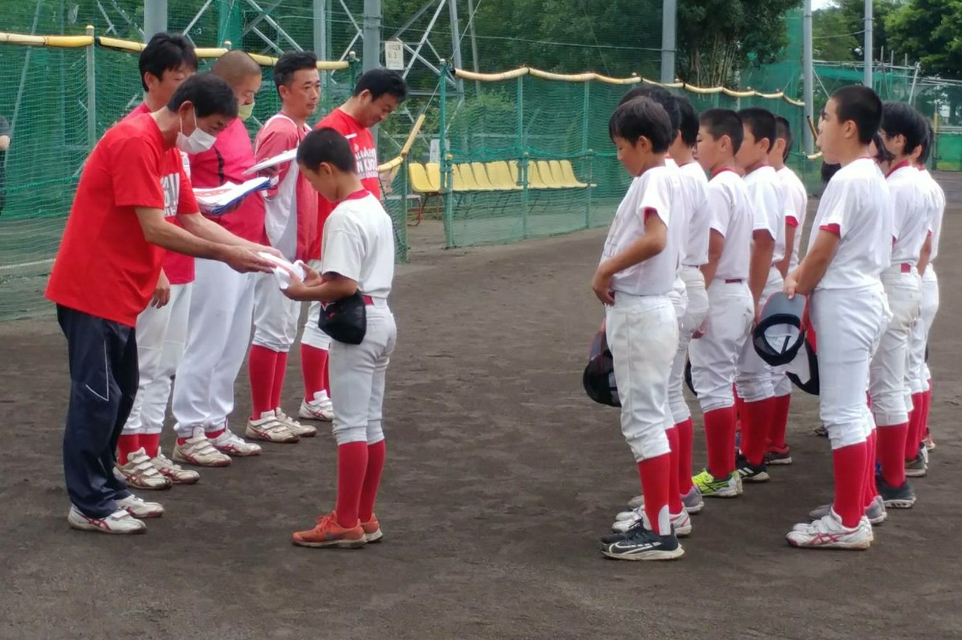 監督より一言頂き、背番号をうけとる選手達。中1組3人はリトルでは最後の背番号・・・。