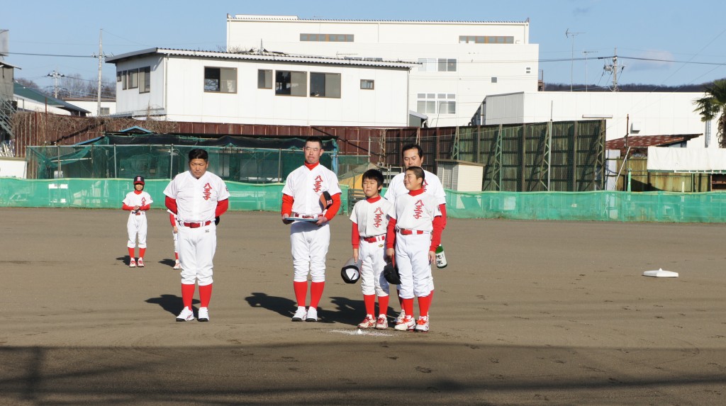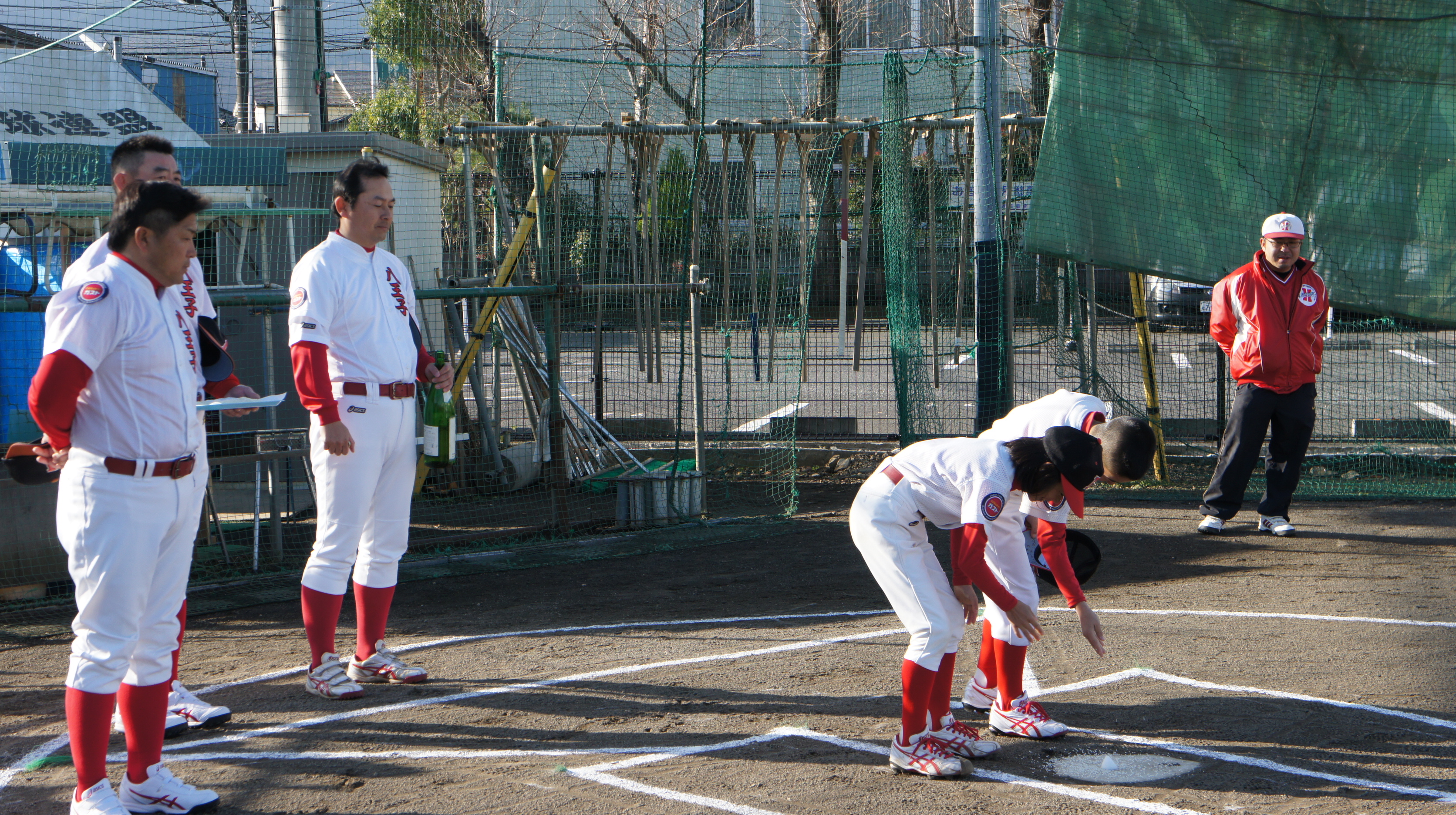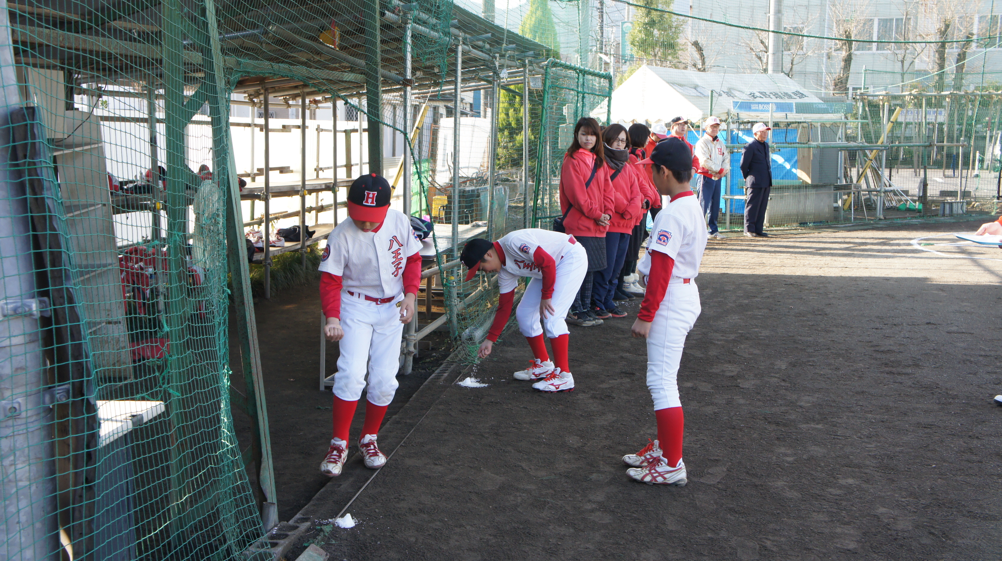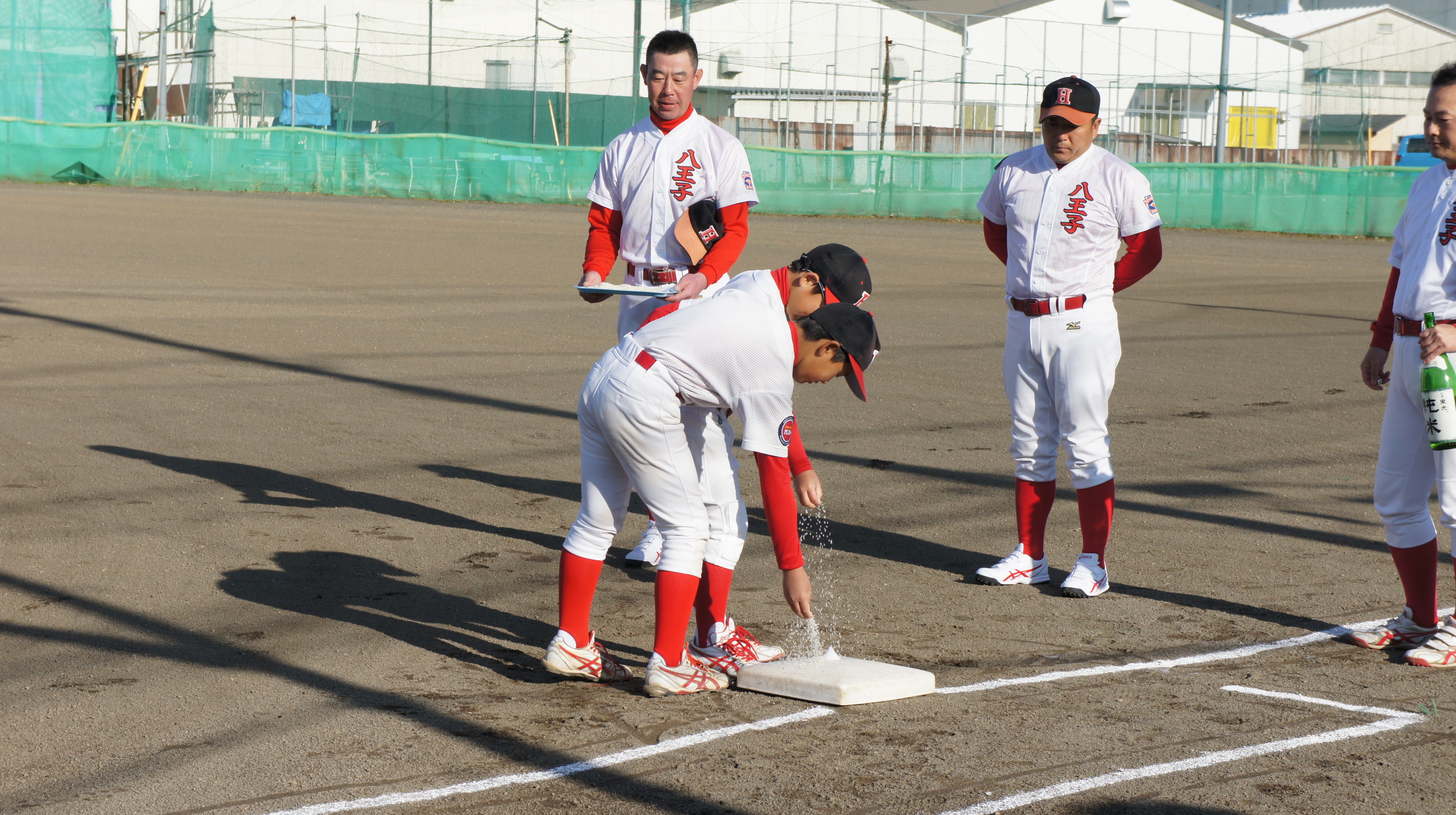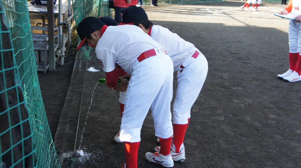 1年間お世話になったグラウンドに感謝の意を表し、各自のポジションを塩、米、清酒にて清めるグラウンド納めが行われ、年内の活動が終了しました。